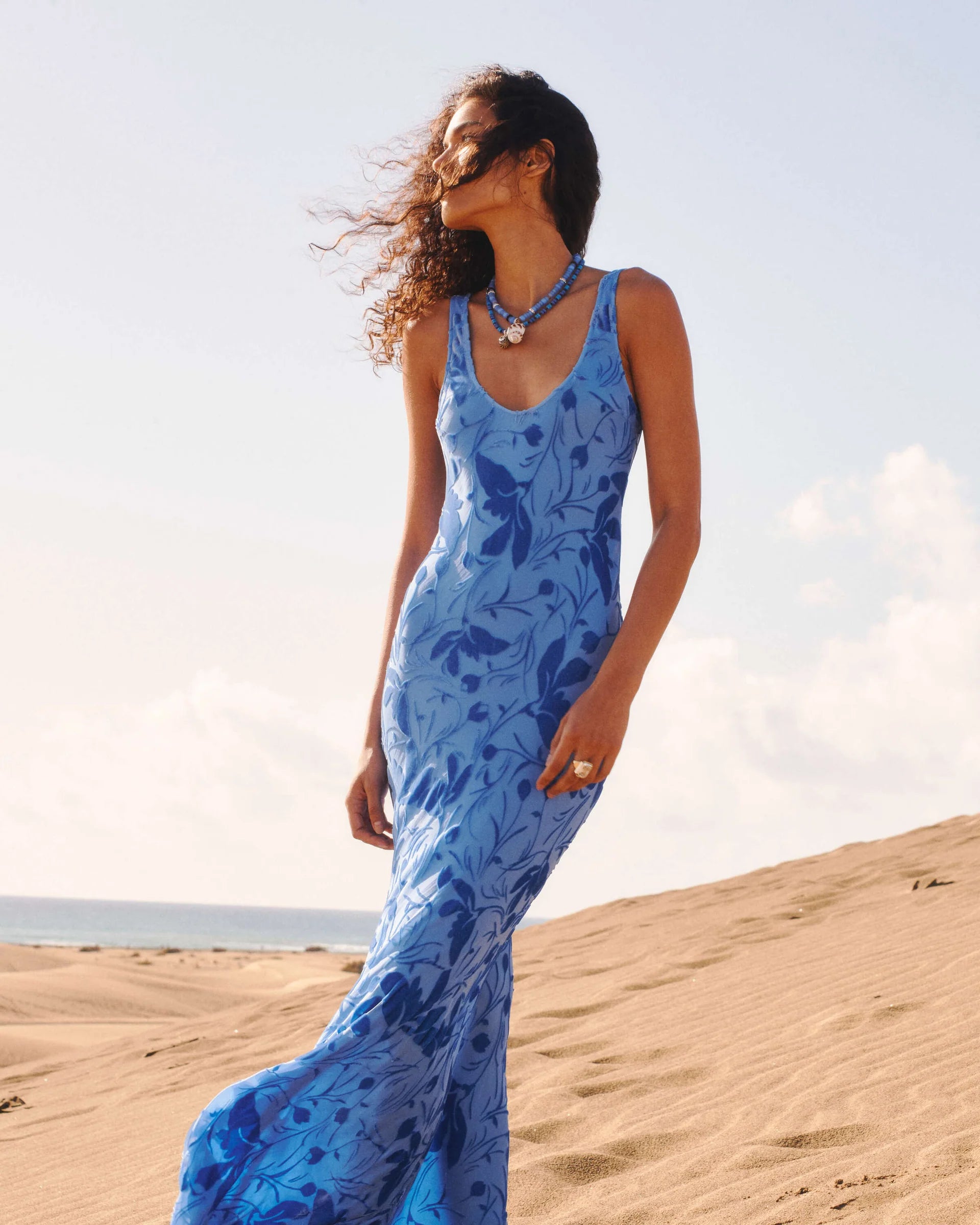 The Inez Dress by Rat & Boa falls softly over the body, with a low scoop neckline and a striking open back. The blue print feels bold but effortless, catching the light as it moves.